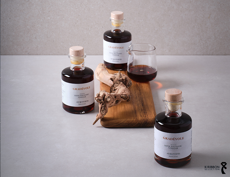 〈그라데볼레 샤인발사믹 식초 화이트〉는 경북 상주 고랭지에서 재배한 샤인머스캣 100%로 만든 프리미엄 발사믹 식초입니다. 한국 전통 발효 기술과 지역 특산물이 만나 탄생한 국내 유일의 발사믹으로, 6년간 자연 발효한 식초에 진공 농축한 샤인머스캣 농축액을 더해 깊고 부드러운 풍미를 자랑합니다.