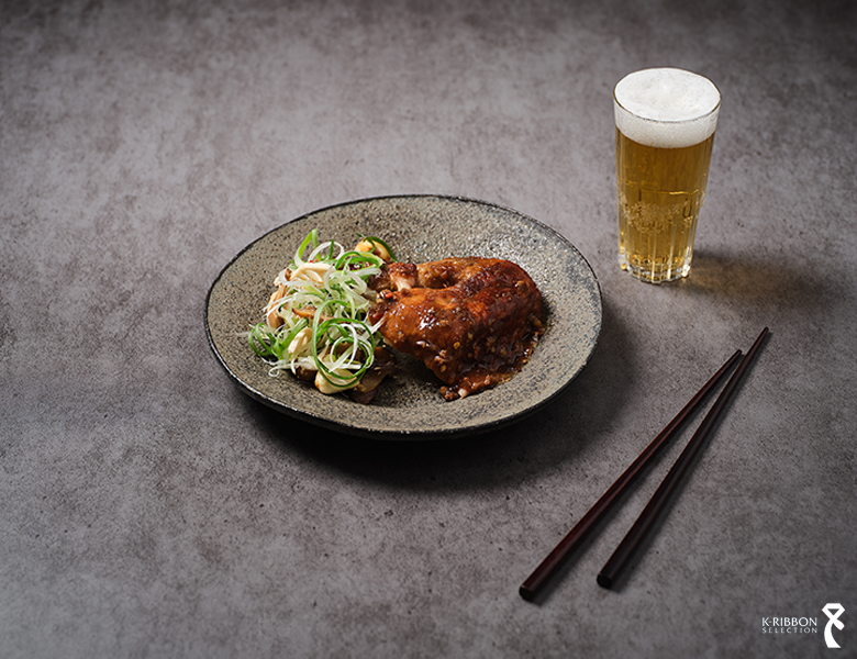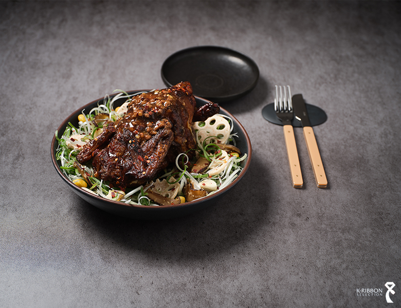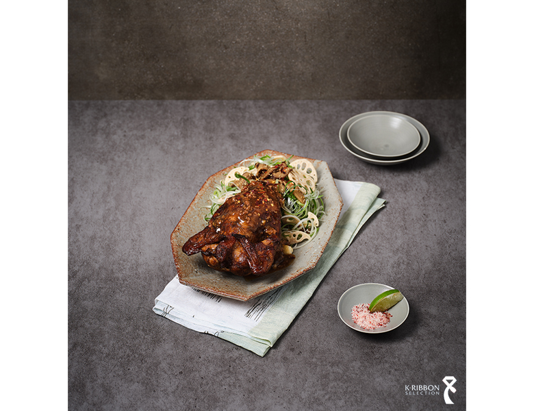 셰프가 외국인을 위해 개발한 신메뉴입니다. 닭은 100% 국내산 참나무 장작불에 한 시간 이상 구워 겉은 바삭하고 속은 촉촉하며 훈연의 맛을 느낄 수 있고, 닭 속에는 찹쌀, 초리조, 건표고버섯, 닭기름에 조리한 마늘을 넣어 만든 찹쌀밥을 채워 풍미를 더합니다. 여기에 불고기 소스와 함께 대파 무침, 표고버섯 나물, 연근 칩, 마늘 칩을 고명처럼 곁들이며 식감과 향을 겹겹이 쌓아, 한국인에게는 익숙하고 외국인에게도 부담 없는 맛으로 새로운 미식 경험을 선사합니다.