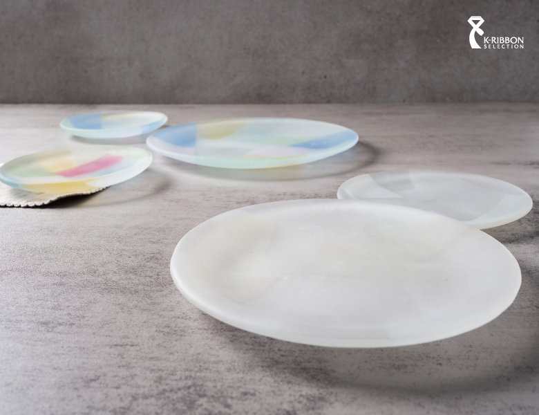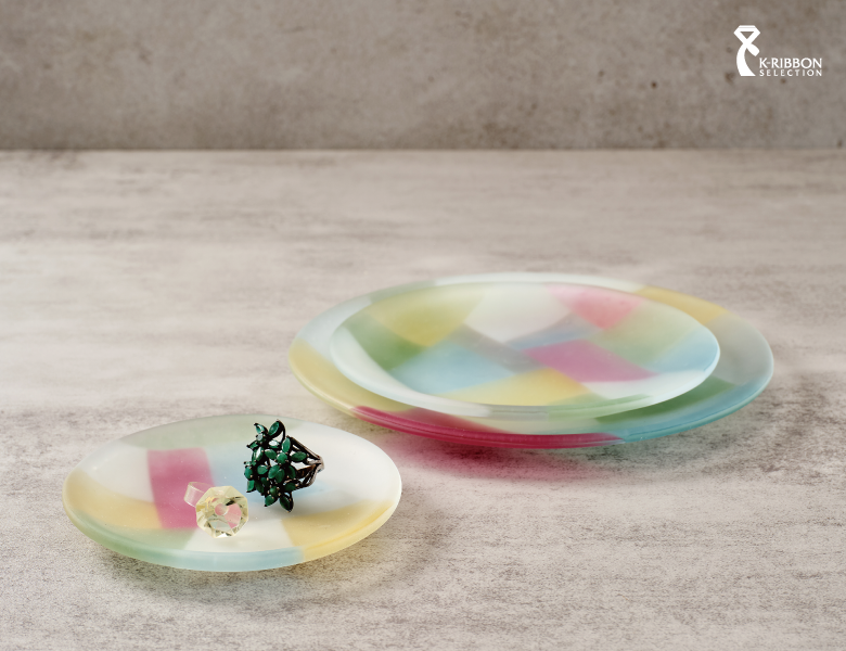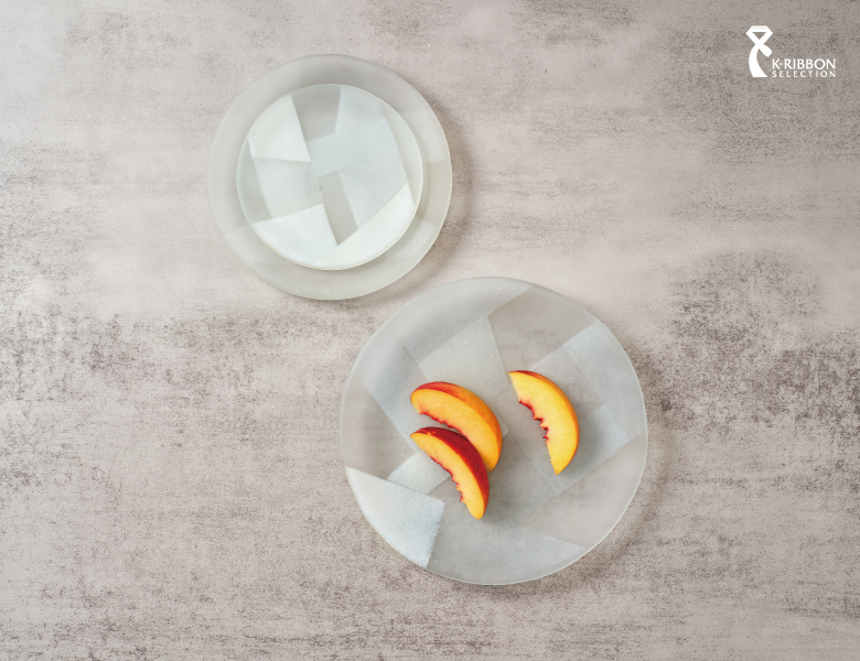 〈조각보 접시〉는 색색의 천 조각이 보자기라는 사각 틀 안에서 조화를 이루는 조각보의 전통을 원형 유리 접시라는 새로운 형태와 소재로 재구성했습니다. 소박하면서도 창의적인 조각보의 문법을 유리와 조합해 색과 색 사이에 존재하는 짙고 옅은 색의 층위를 드러내며, 기물에 온화한 표정을 부여합니다.