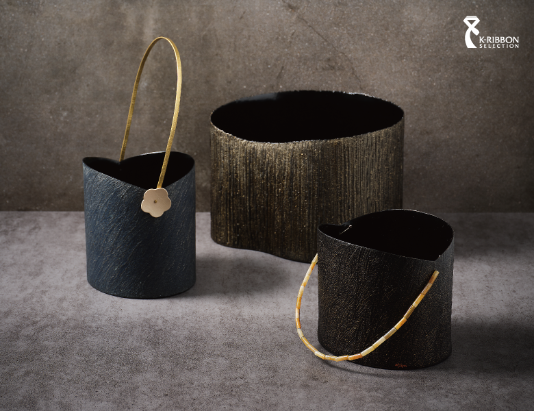 옻칠로 한 겹 한 겹 쌓아 올린 검은 표면은 쓸수록 깊이를 더하고, 흙을 섞어 만든 독특한 질감은 밭의 거친 결을 연상시킵니다. 여기에 가느다란 금속 선이나 구슬을 활용한 손잡이가 더해져, 단단함과 섬세함이 하나의 기물 안에서 균형을 이루며 옻칠 공예를 일상 가까이로 불러들입니다.