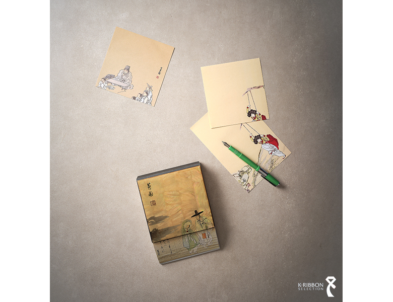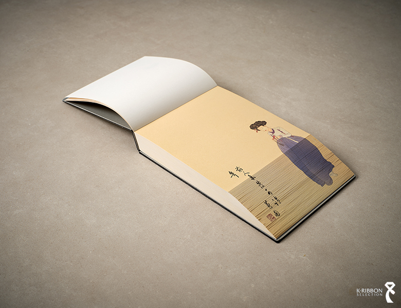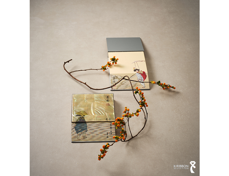 〈민화 자개 노트〉는 나전칠기에서 영감을 받아 얇게 편 자개판 위에 조선 후기 대표 화가 신윤복의 풍속화를 디지털 인쇄로 담았습니다. 나전칠기는 전복·소라·진주조개 껍질 안쪽의 영롱한 진주층을 잘라 기물 표면을 장식하는 전통 공예로, 옻칠과 연마 등 수십 단계의 정교한 수작업을 거쳐 완성됩니다.
